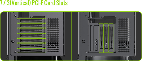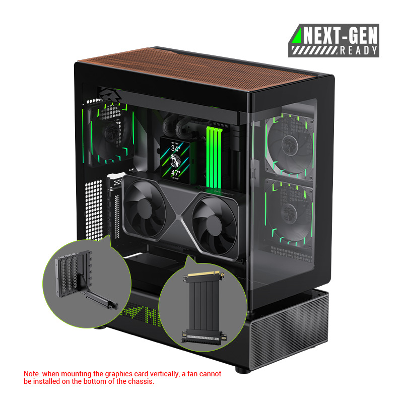 Vertical GPU ready Supports vertical GPU installation with an optional bracket and PCle Riser cable (optional), making your graphics card the visual centerpiece. | ![]() ![]() |