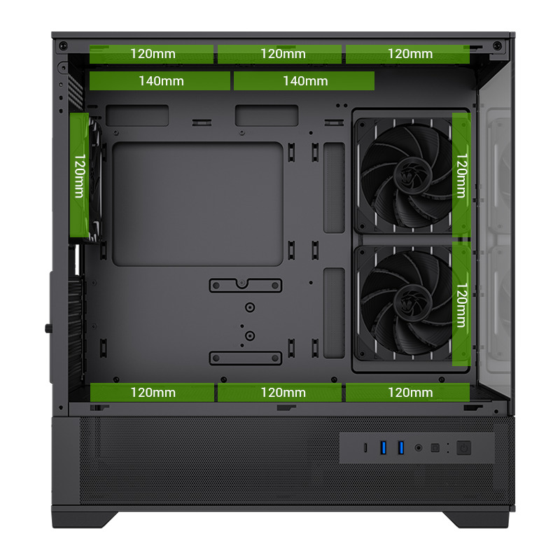 Cooling fans Top plate: 3x120mm/2x140mm (optional) Back plane: 1x120mm (pre-installed) Mother board: 2x120mm (pre-installed) Power Supply Bay: 3x120mm (Optional)