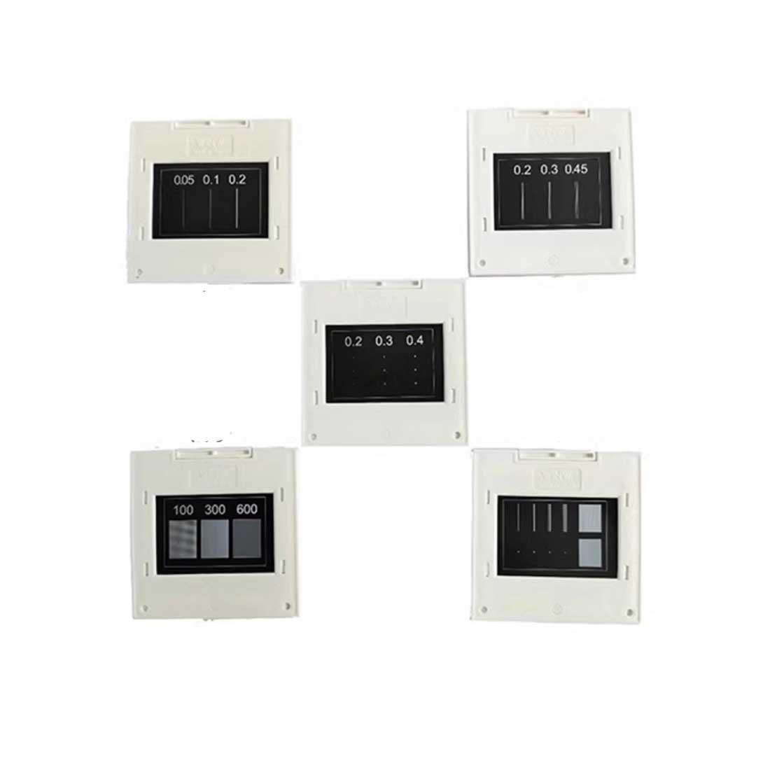 - с единични прорези, 2 процепа, 3 процепа, 4 процепа, множество линии (30 и 60 линии/mm, кръгли отвори (D 0.36 mm), триъгълни отвори (страна 0.3 mm), квадратни отвори (страна 0.2 mm), правоъгълни отвори (0.6 x 0.28 mm); всички прорези с ширина 0.06 mm с разстояние 0.05 mm;