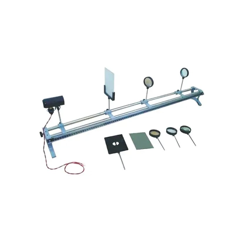 Оптичен комплект, предназначен за основни оптически експерименти – изображения чрез лещи и огледала. Елементите са монтирани в защитни рамки с монтажни пръти за лесно подравняване, а четирите захвата имат индексна маркировка и фиксиращи винтове за закрепване.