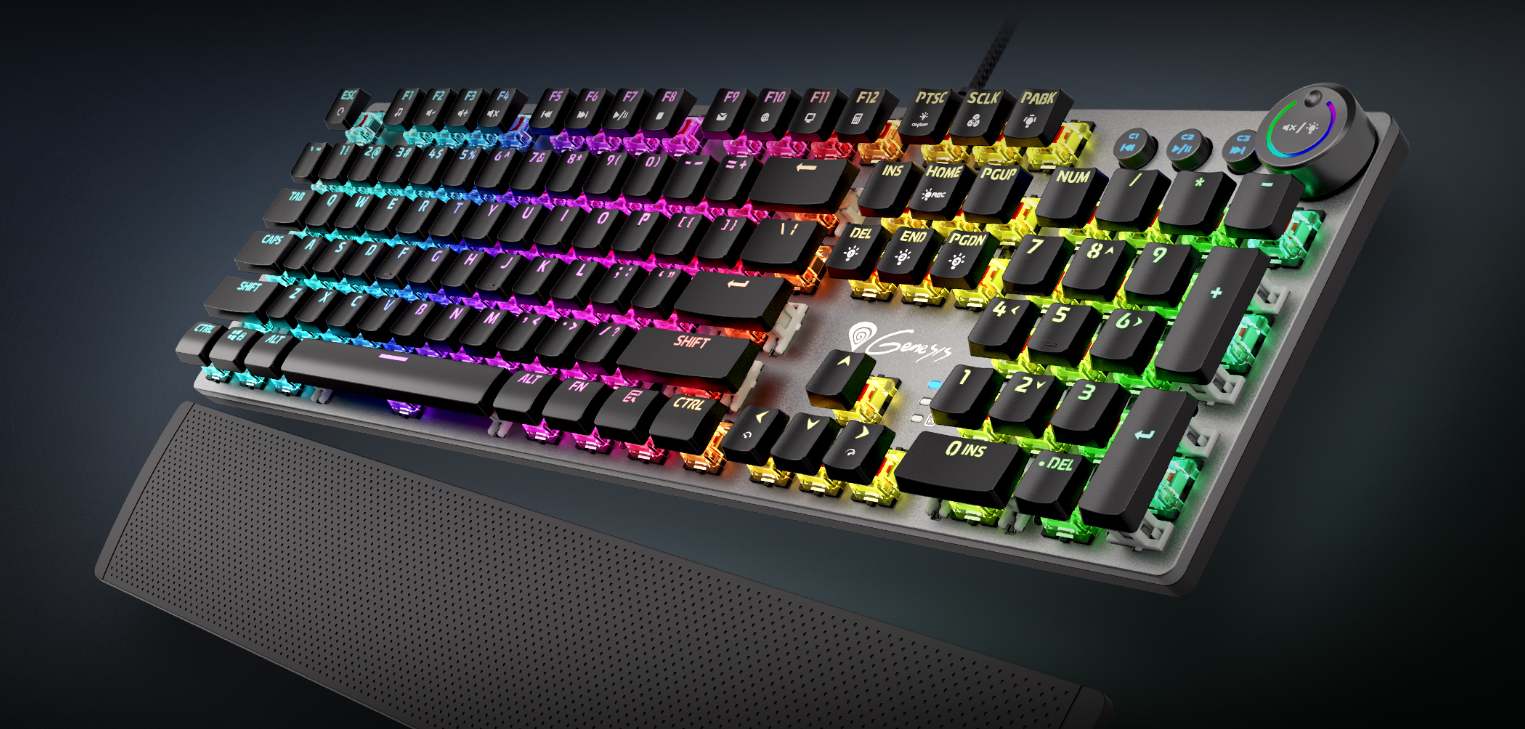Thor 400 RGB has 12 multimedia keys located on the F1 - F12 buttons, which allow you to manage music and efficiently open applications such as calculator or mail. In addition, the keyboard is equipped with an innovative, illuminated function knob, thanks to which controlling the volume and brightness of the backlight is even more convenient and faster!
