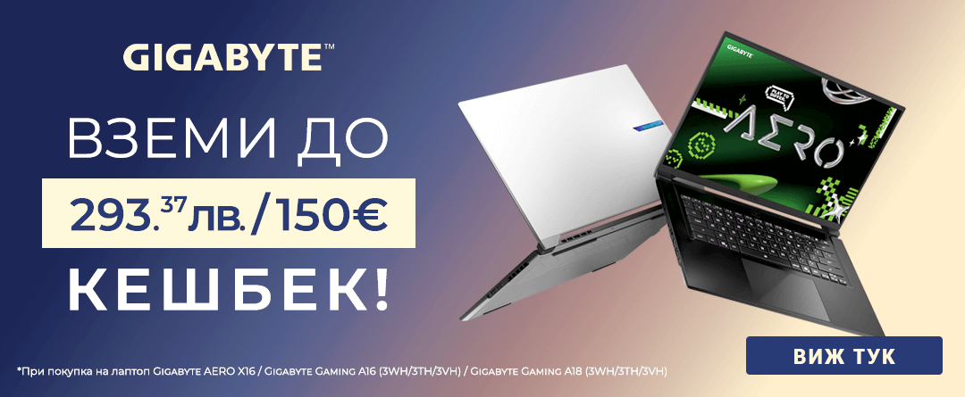 Можете да заявите до 293.37 лева / 150 Евро кешбек, когато закупите избрани модели лаптопи Gigabyte между 24.12.25 и 18.01.26