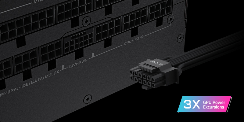 ATX 3.0 and PCIe Gen 5.0 ready (compatible with ATX 3.1) The AE1000PM PG5 can sustain power excursions of up to 3 times the GPU power and 2 times the total power. It's fully compliant with the Intel ATX 3.0 standard, supporting up to 200% power excursions and achieving 70% efficiency at low loads. Additionally, the included high-quality, native 16-pin cable ensures compatibility with PCIe Gen 5.0 graphics cards, delivering up to 600 watts of power. | ![]() |