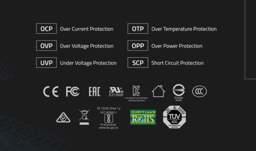 Protection In order to make sure the entire computer system to operate stably under any conditions, we not only added protection designs such as OCP, OTP, OVP, OPP, UVP and SCP, but also ensured the stable operation of your system through the safety certification of various countries. | ![]() |