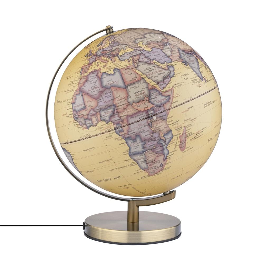 Глобус с диаметър 30 см, вградено осветление с 3 нива на яркост чрез сензорна функция, включва захранващ адаптер с GaN и технология за бързо зареждане Power Delivery, 20 W с USB-C и USB-A порт, основа от матиран метал в антично златист цвят, релефна карта, подвижна ос, метал, пластмаса, мат, антично жълто/многоцветно