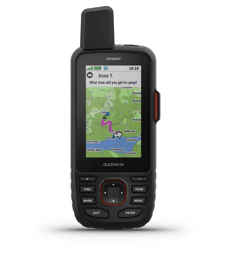 | 100% ГЛОБАЛНА IRIDIUM САТЕЛИТНА МРЕЖА Вместо да разчитате на покритие на мобилни телефони, сега Вашите съобщения, SOS сигнали и проследяване се прехвърлят през глобалната сателитна мрежа на Iridium. | GARMIN MESSENGER ПРИЛОЖЕНИЕ Изтеглете приложението Garmin Messenger на Вашия съвместим смартфон и го сдвоете с Вашия ръчен GPS GPSMAP® 67i за бързо, лесно изпращане на съобщения и 24/7 SOS, което не е ограничено до зоните на покритие на мобилния телефон. Приложението поддържа и групови съобщения. | ОПЦИЯ ЗА INREACH WEATHER Използвайте inReach свързаност, за да получите подробни актуализации за времето на ръчния GPS GPSMAP 67i. Поискайте прогнози за времето за Вашето текущо местоположение, точки или дестинации по Вашия маршрут. |