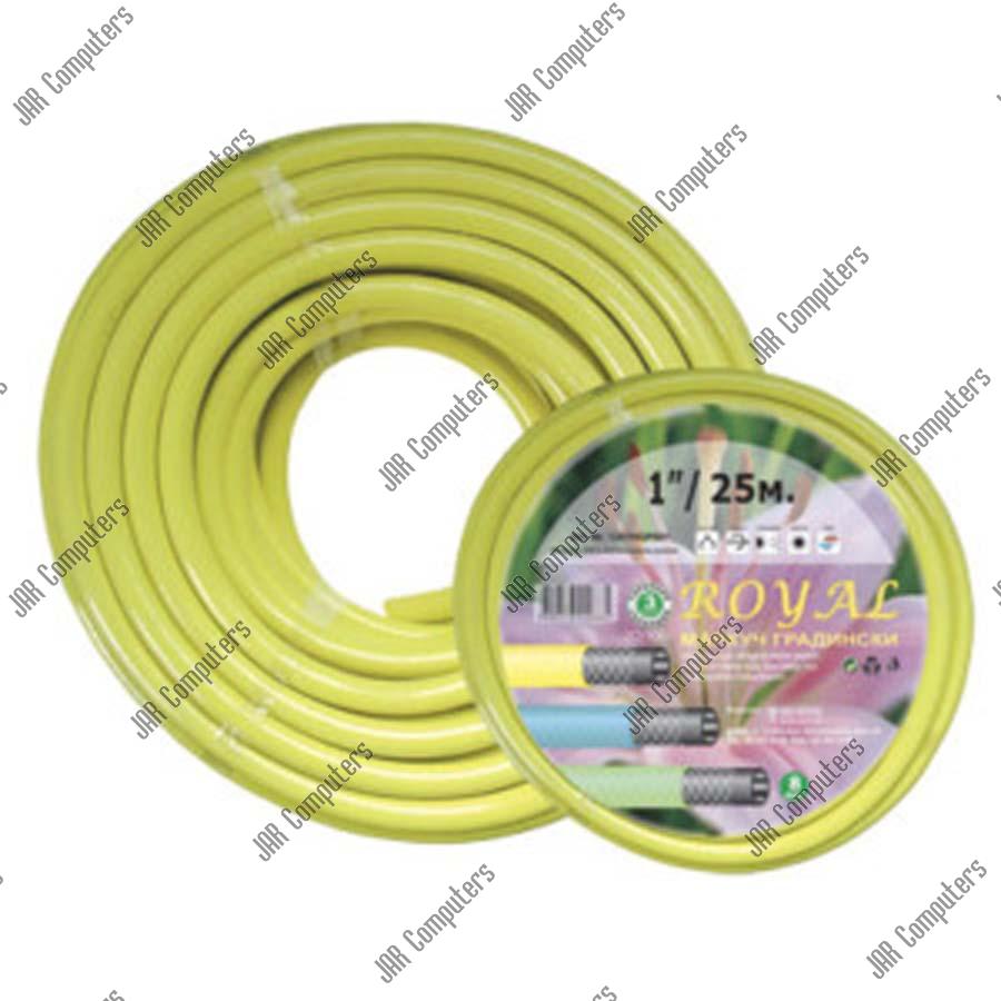 Маркуч градински ROYAL е подходящ за употреба през всички сезони. Размерът на маркуча е 1 инч, вътрешен диаметър 25 мм и дължина 50 м. Маркучът не се усуква, изработен е два слоя + оплетка, която не позволява на маркуча да се прегъва. Термоустойчив от -5 до +40 градуса, UV устойчив той е добро решение за всеки двор и градина.