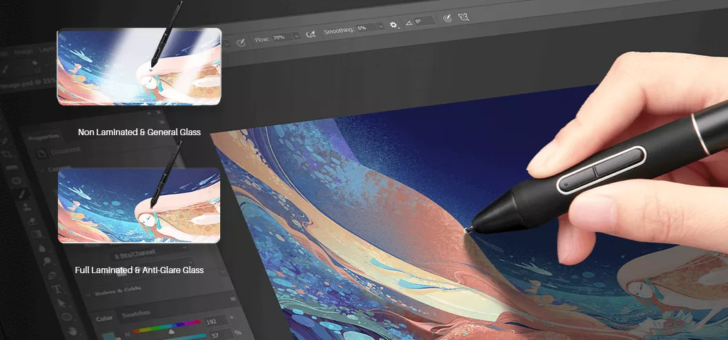 Like its predecessor, Kamvas Pro 13 (2.5K) is equipped with Anti-Glare etched glass to efficiently prevent glare from the outside environment. It also can enhance the screen surface friction to make it more like a paper texture. At the same time, the full-laminated technology can improve brightness for a more transparent screen and allow the pen tip to fit perfectly with the cursor.