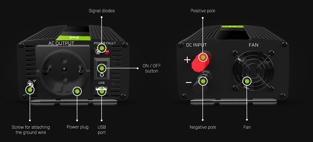 - Versale and adaptable - Green Cell inverter is not only equipted in sockets to which you can connect electrical devices, but it also has a USB port suitable to charge smaller gadgets such as a smartphone or a tablet