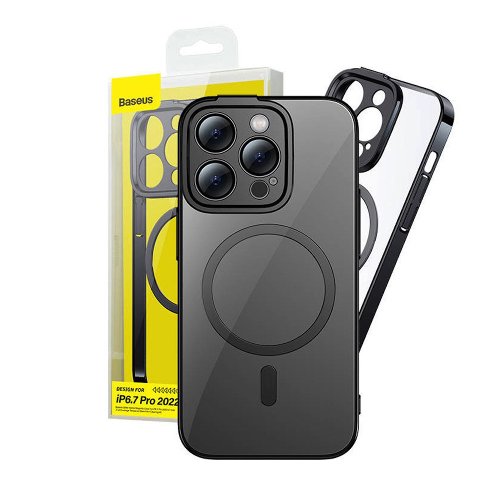 Хибриден удароустойчив кейс с MagSafe и стъклено защитно покритие за дисплея на iPhone 14 Pro Max - Baseus Glitter MagSafe Hybrid Protection Set (черен-прозрачен)