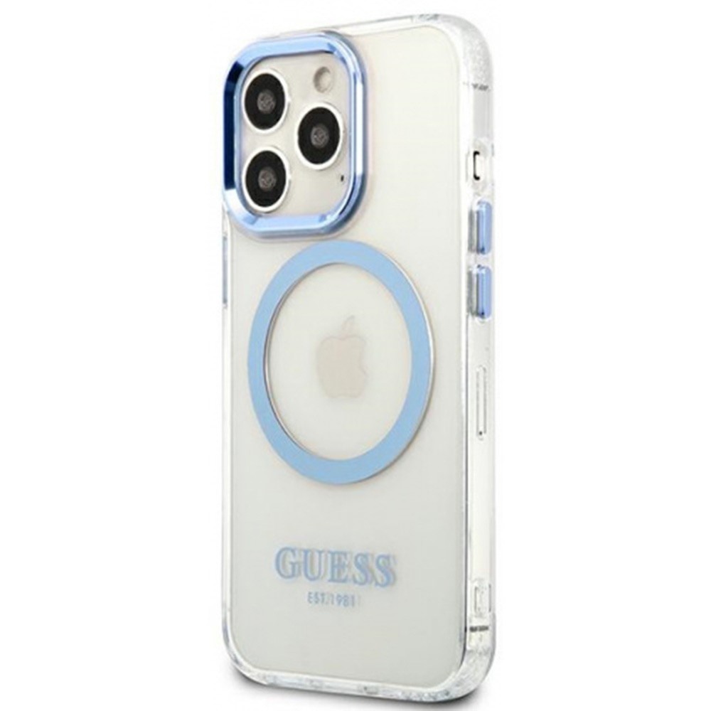 Хибриден удароустойчив кейс с MagSafe за iPhone 13 Pro - Guess Metal Outline MagSafe Case (прозрачен-син)