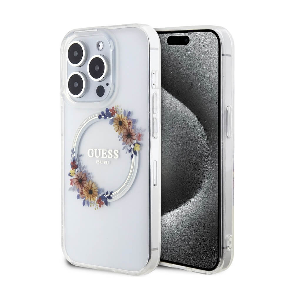 Хибриден удароустойчив кейс с MagSafe за iPhone 15 Pro - Guess Flowers Ring Glossy Logo MagSafe Case (прозрачен)