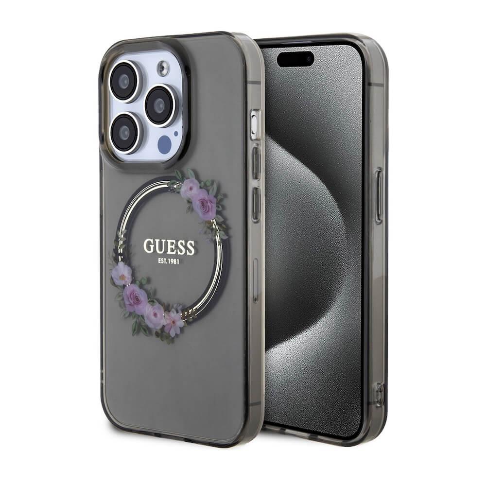 Хибриден удароустойчив кейс с MagSafe за iPhone 15 Pro - Guess Flowers Ring Glossy Logo MagSafe Case (черен-прозрачен)