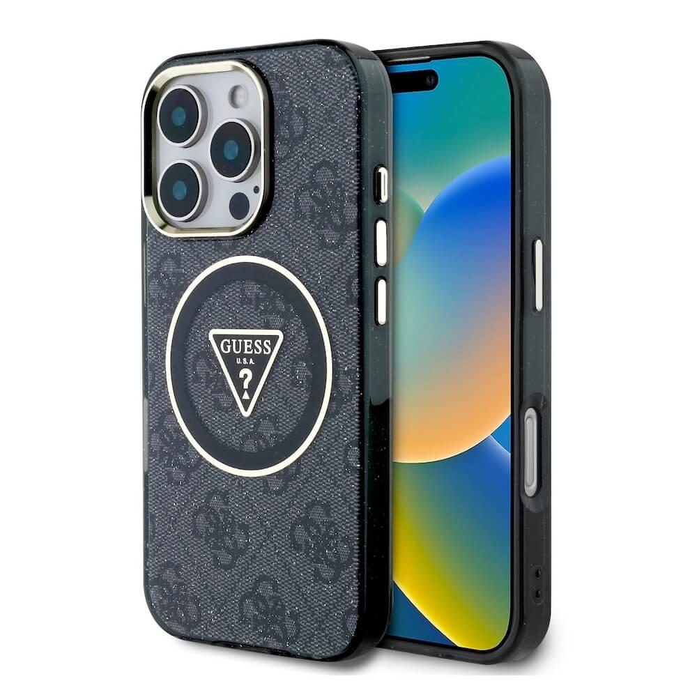 Хибриден удароустойчив кейс с MagSafe за iPhone 16 Pro - Guess IML 4G Glitter And Triangle Logo MagSafe Case (черен)