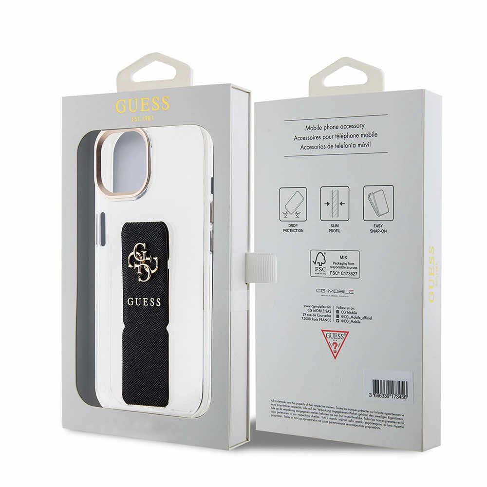 Хибриден удароустойчив кейс с поставка за iPhone 15 - Guess PU Grip Stand 4G Metal Logo Case (прозрачен)