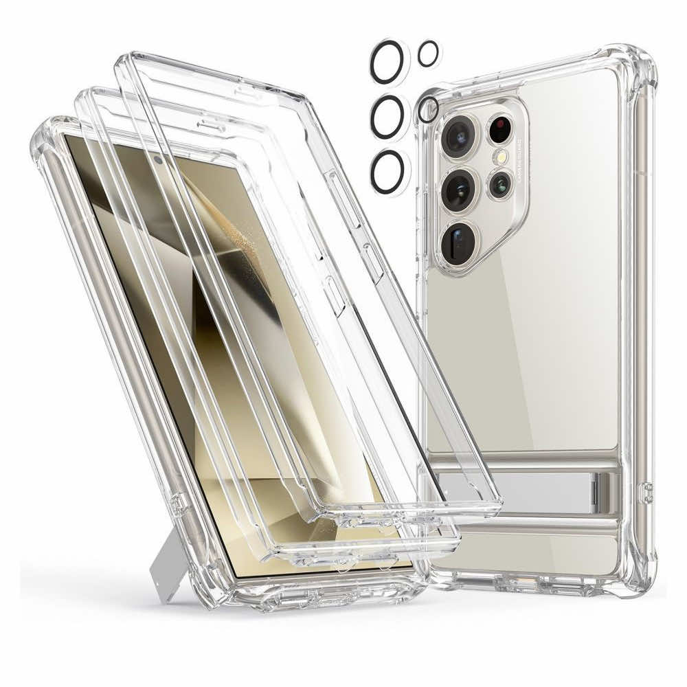 Хибриден удароустойчив кейс с вграден стъклен протектор за дисплея и протектори за камерата за Samsung Galaxy S24 Ultra - ESR Armor Kickstand Case (прозрачен)