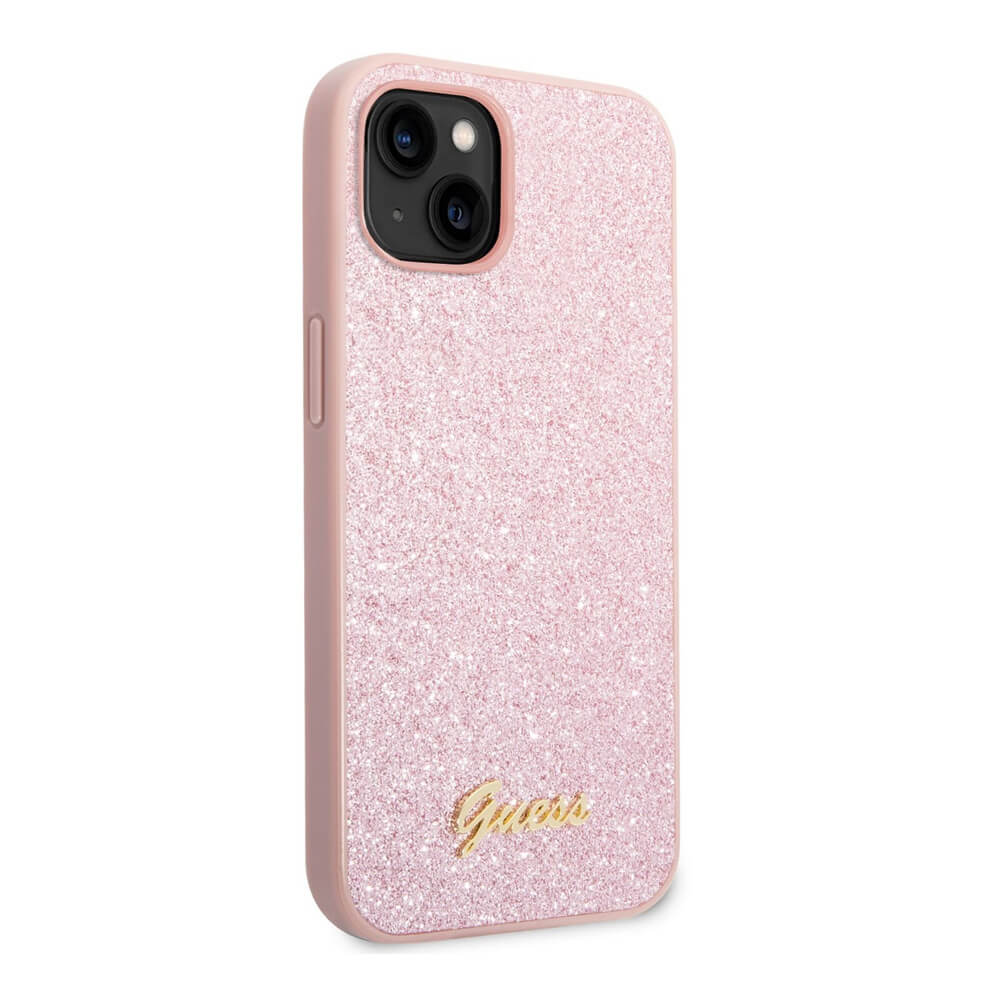Хибриден удароустойчив кейс за iPhone 14 - Guess Glitter Flakes Metal Logo Case (розов)