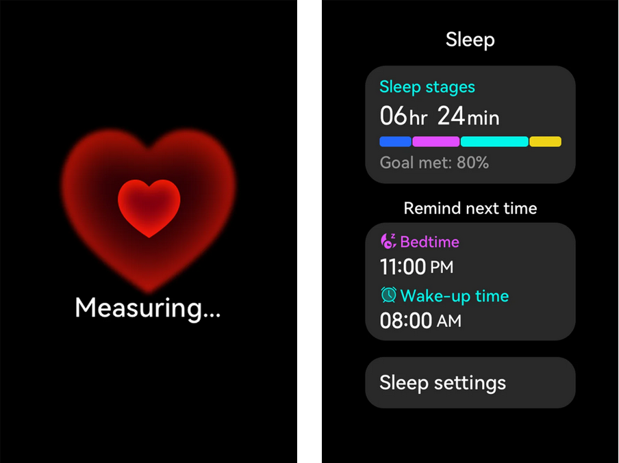 Heart Rate Monitoring Stay in tune with your body through real-time heart rate tracking. Effortlessly keep tabs on your heart health & ensure you're always within your optimal range. | Sleep Quality Analysis Monitor your sleep patterns to optimize your rest and recovery. Gain valuable insights into your sleep cycles and improve your nightly routine, helping you wake up refreshed and ready to take on the day. |