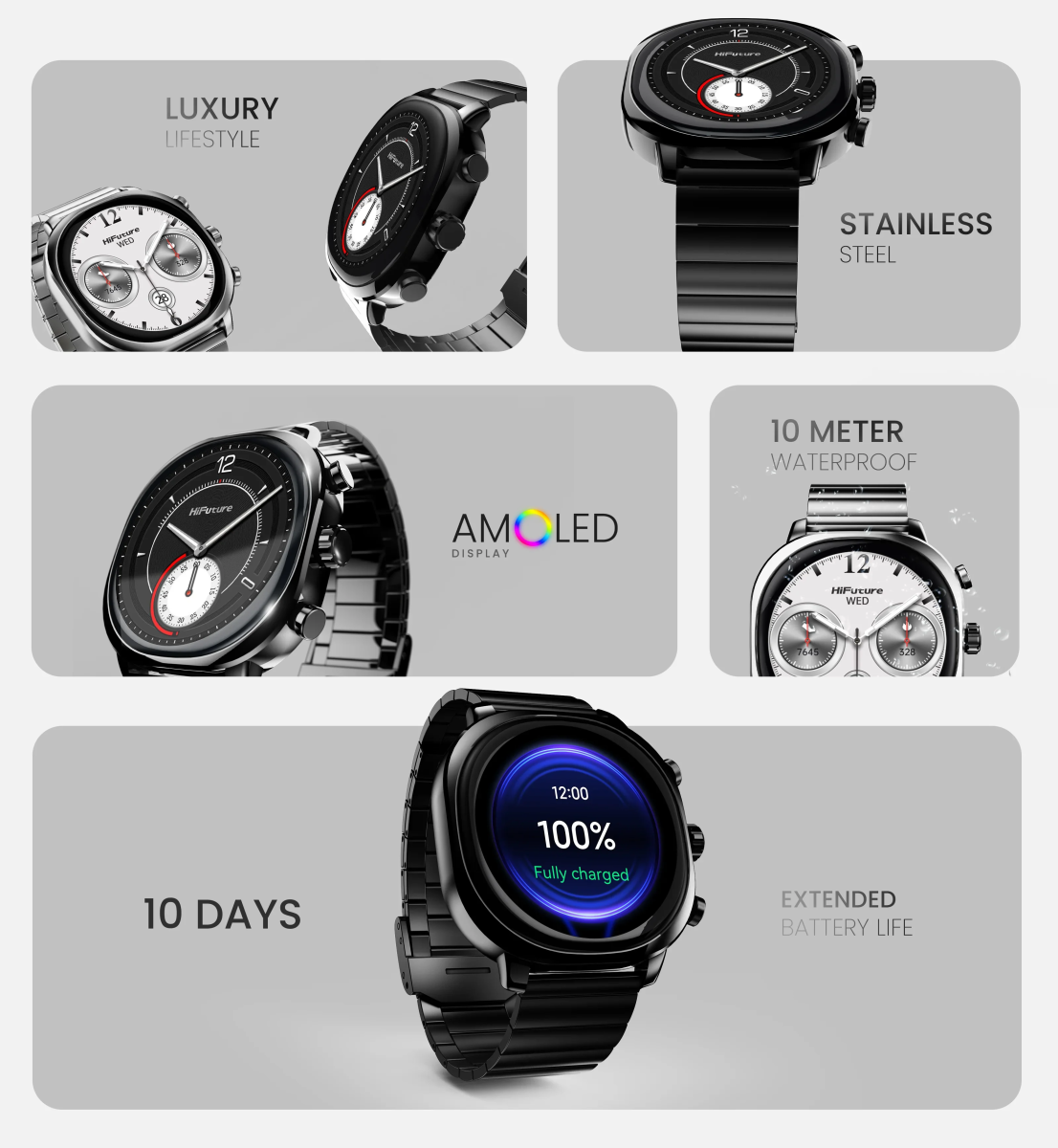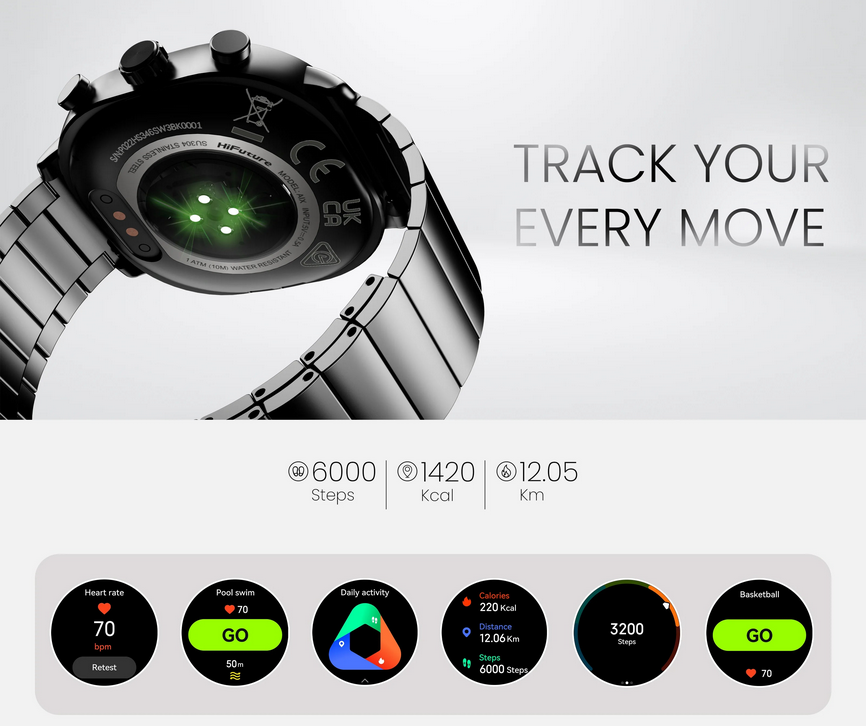 Add some vibrancy to your style, crafted from durable stainless steel, HiFuture's AIX smartwatch combines a timeless aesthetic with a shimmering metal shine that catches the eye. Its Swiss-inspired craftsmanship brings a touch of elegance, sophistication and reliability to your wrist while embracing cutting-edge technology.
