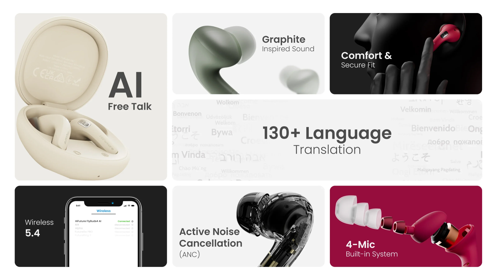 Hear translation on the spot. FlyBuds4 AI supports 130+ live language translations, making every conversation simple without checking your phone. FlyBuds4 AI brings you closer to people by removing language barriers and background noise.