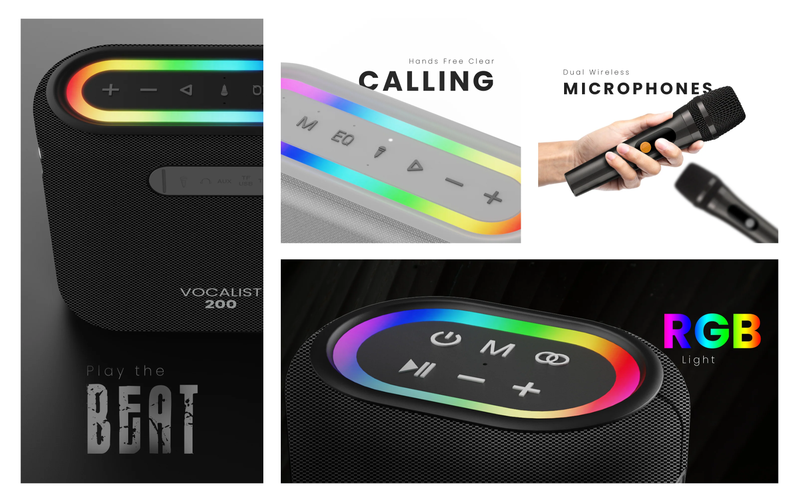 Vocalist 300 Experience ultimate battery life with an 18000mAh capacity, and keep your devices charged with the integrated power bank. | Own the Stage It’s time for you to take center stage with Vocalist’s dual wireless microphone. Be a pop star of your life, play your favourite songs, and have a fun singing session. |