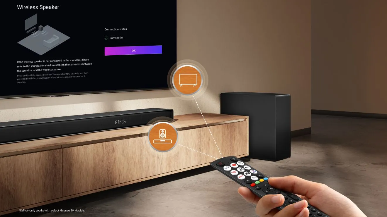 EzPlay 3.0 One remote control Easily control your Hisense Soundbar's sound modes through your Hisense TV remote to optimize audio and dialogue. Thanks to EzPlay 3.0, real-time wireless speaker status is displayed on your TV for seamless control.*EzPlay only works with select Hisense TV Models. | ![]() |