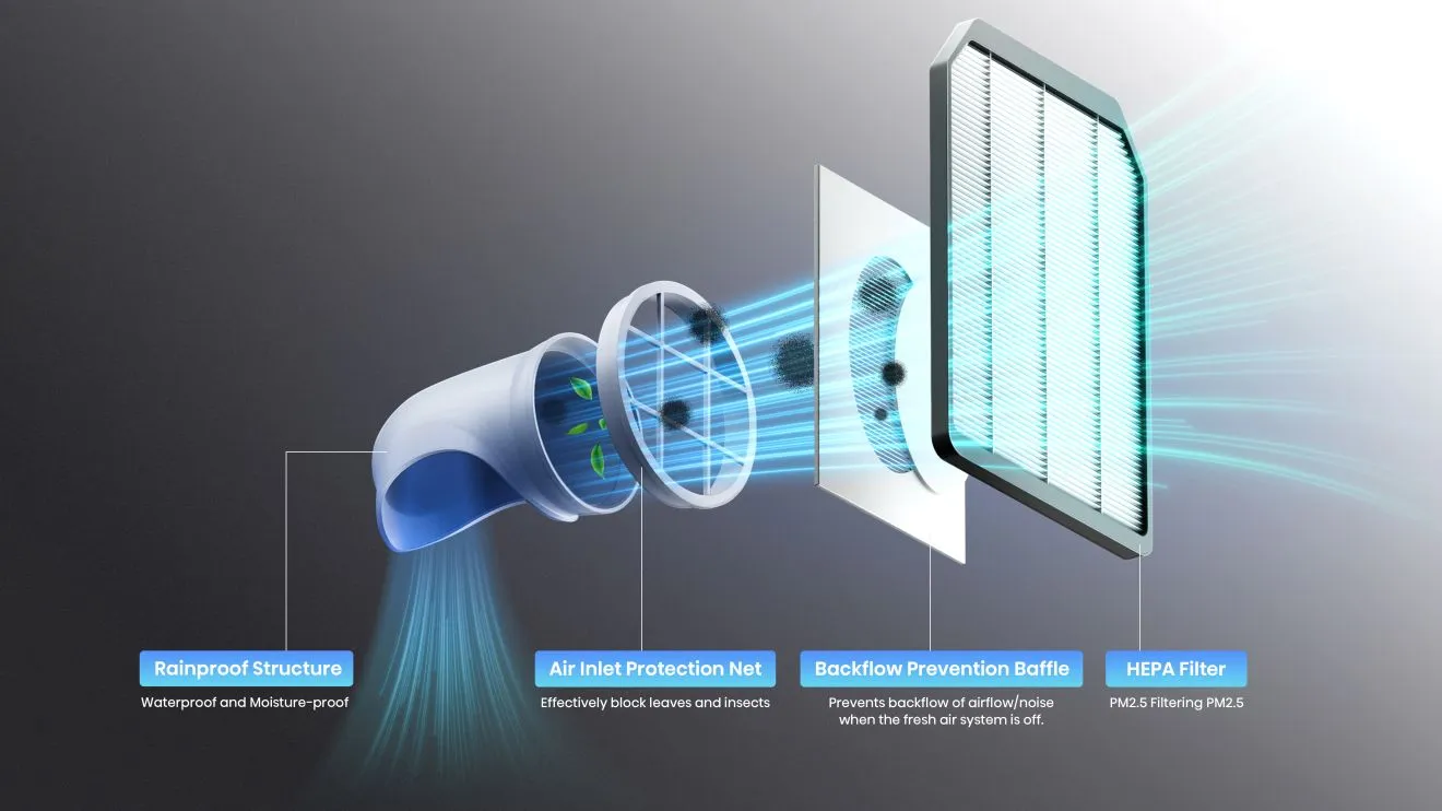 The HEPA filter can effectively purify large particles, PM2.5 pollen, dust, etc. ensuring that the incoming new air from outside is clean. The filtration efficiency for PM2.5 reaches 97.5%.