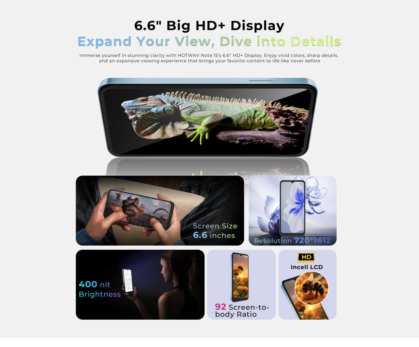 Смартфон Hotwav Note 15 (син), поддържа 2 SIM карти, 6.6" (16.76cm) дисплей, осемядрен Unisoc SC9863A 1.6 GHz, 4GB RAM, 64GB Flash памет (+microSD слот), 13 & 5 Mpix камери, Android136.20 лв
