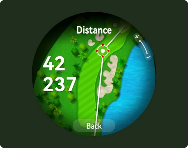 Проследяване на разстоянието с едно докосване Часовникът предоставя точни разстояния до опасностите в реално време, както и предната, централната и задната част на грийна за стратегическо планиране. | ![]() |