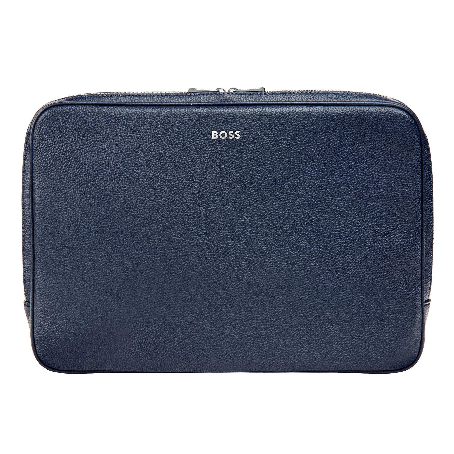 Компютърният калъф Grained Classic е изработен от висококачествен материал с нежна текстура, наподобяваща естествена кожа, и е завършен с елегантна хромирана плочка с логото BOSS и стилни хромирани ципове. Вътрешността е подплатена с монохромен монограм, който подчертава премиум усещането. Благодарение на функционалната си вътрешна организация, моделът предлага достатъчно място за документи, химикалки, телефон, кабели, карти и други ежедневни принадлежности.