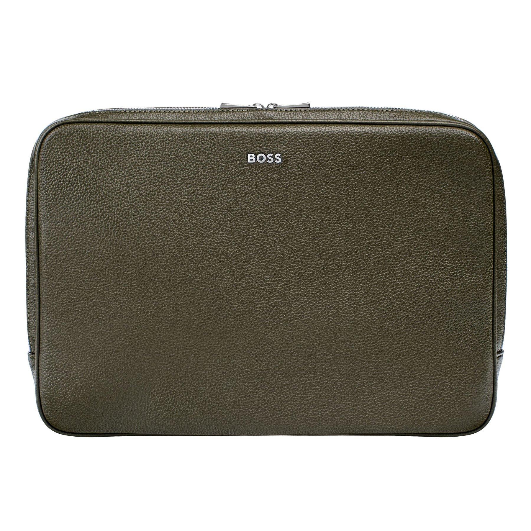 Компютърният калъф Grained Classic впечатлява с мека текстурирана повърхност, наподобяваща естествена кожа, допълнена от елегантна хромирана плочка с логото BOSS и съответстващи хромирани ципове. Вътрешната подплата с тон-в-тон монограм подчертава прецизната изработка и премиум усещане. С множество отделения и добре обмислена организация, калъфът осигурява място за всичко необходимо — от документи и химикалки до телефон, карти, кабели и аксесоари.