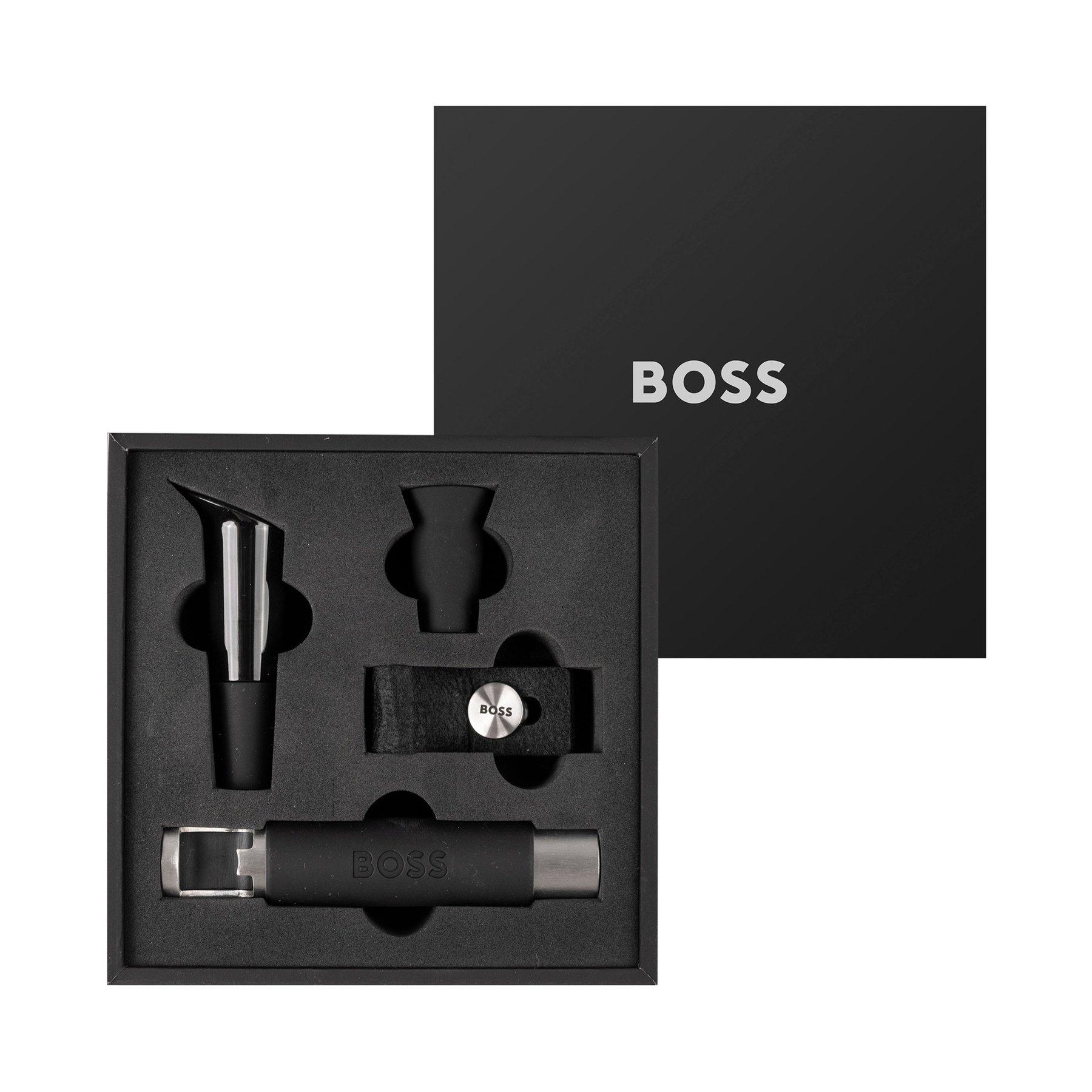 Новият комплект за вино Hugo Boss Iconic е изработен от мека гума и филц от една страна и високоустойчива полирана стомана от другата.