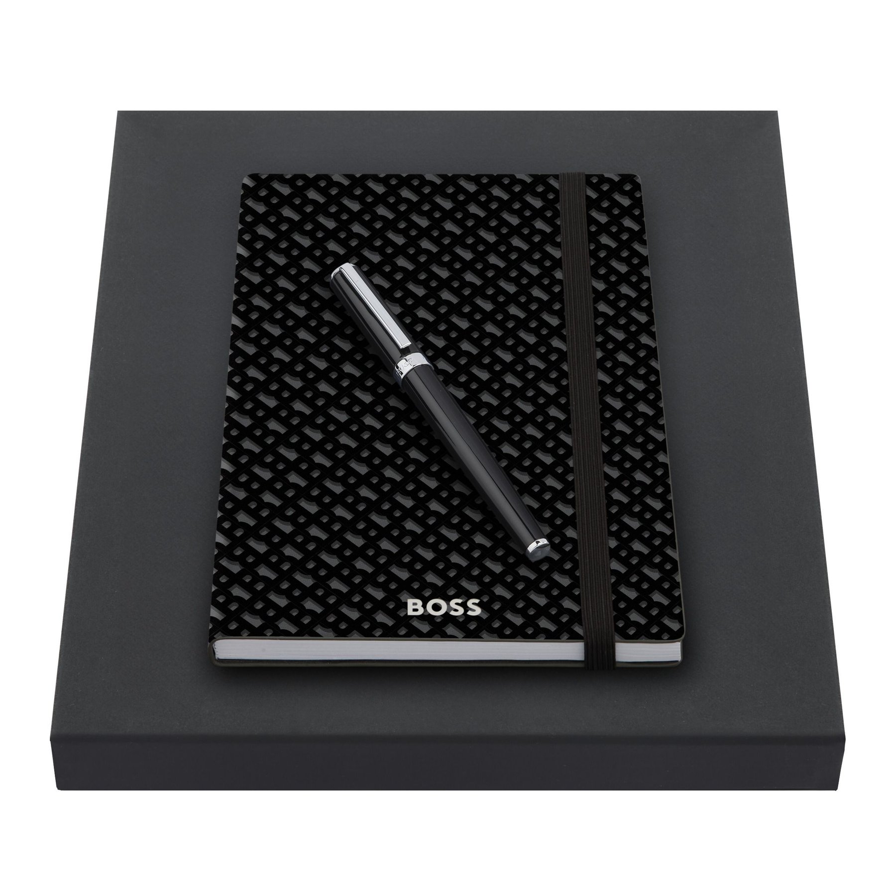 Hugo Boss Комплект тефтер Monogram, А5, широки редове, сив и ролер Gear Icon, черен