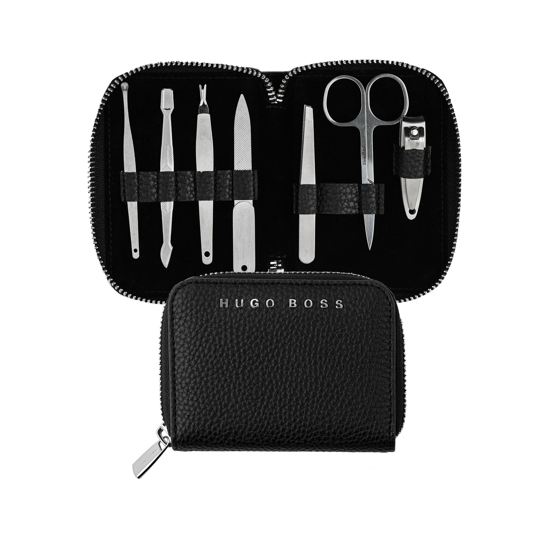 • Комплектът за маникюр "Storyline" е направен от мек, зърнен материал и украсен с красив, хромиран подпис на HUGO BOSS. Съдържа редица инструменти за грижа от четкана стомана: пила за нокти, ножици, пинсети, нокторезачки, почистващо средство за уши, средство за премахване на кожички и пила за кожа. Размерът е изключително компактен и удобен както за пътуване, така и за домашна употреба. На ципа е изобразено логото на марката.