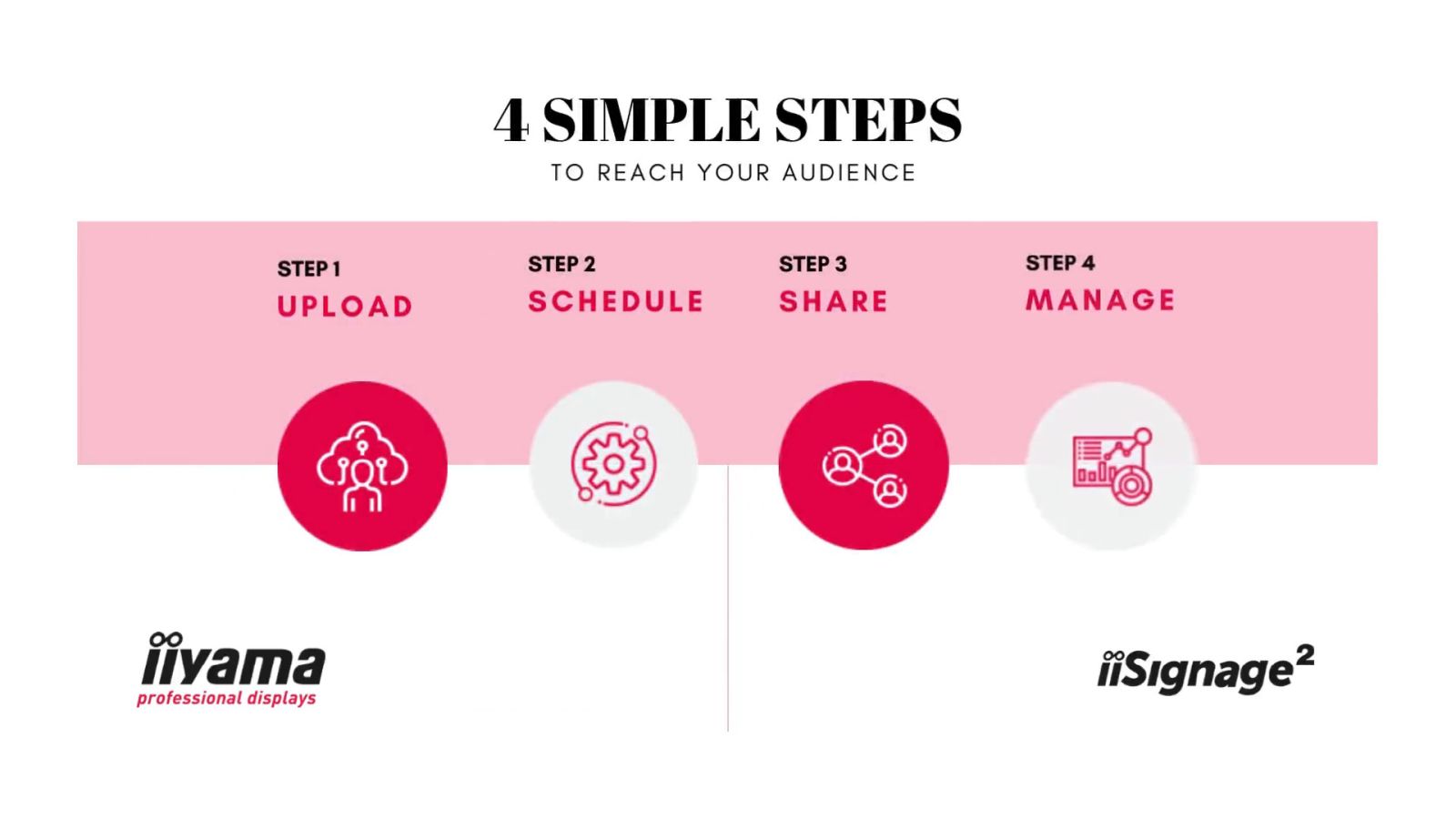 iiSignage² is our digital signage content management platform to easily show and control your content and to manage your displays in a secure way. The Content Management System (CMS) gives you total control of your messaging and advertising remotely and safely.