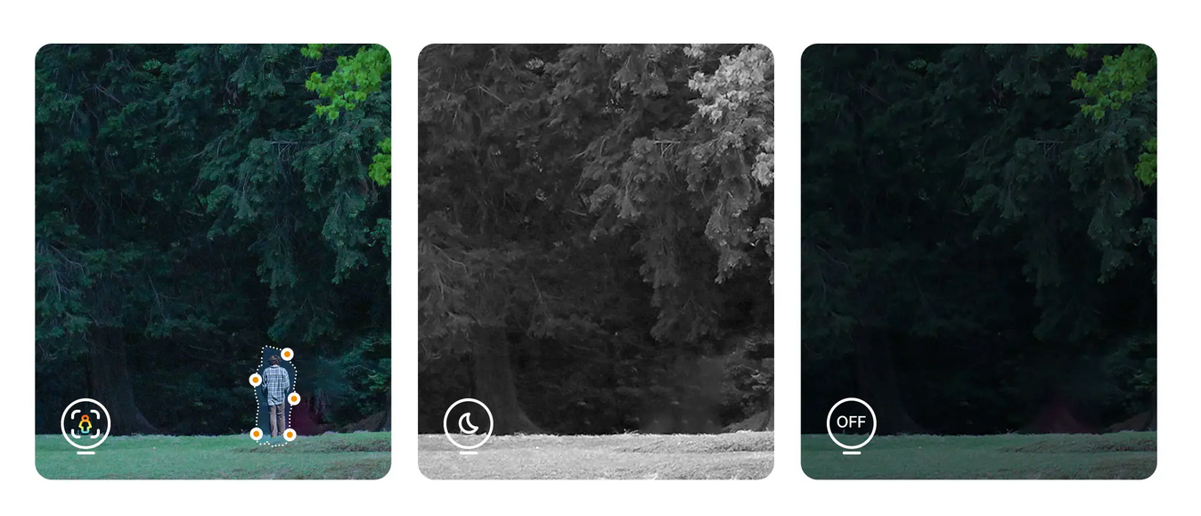 AOV PT може да се настройва към различни режими на нощно виждане според вашите нужди и може автоматично да превключва в цветен режим, когато бъде засечен човек, за да осигури ясно и ярко изображение. Можете също така да деактивирате режима на нощно виждане или да използвате само инфрачервен режим, за да намалите консумацията на енергия.