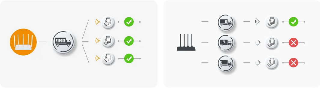 The Wi-Fi 6 standard uses OFDMA for increased efficiency, allowing multi-users play 3D game, watch moving and shopping at the same time, enjoying a faster and smoother internet.