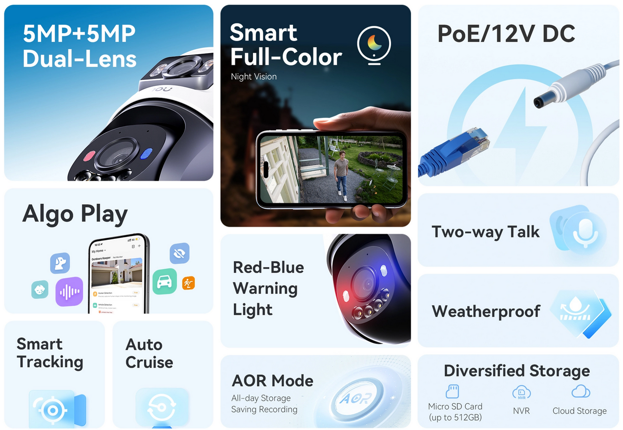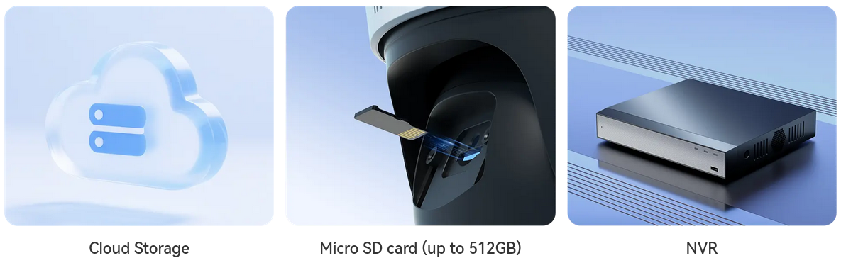 Supports Cloud Storage, Micro SD Card (up to 512GB), and NVR for flexible backup solutions.
