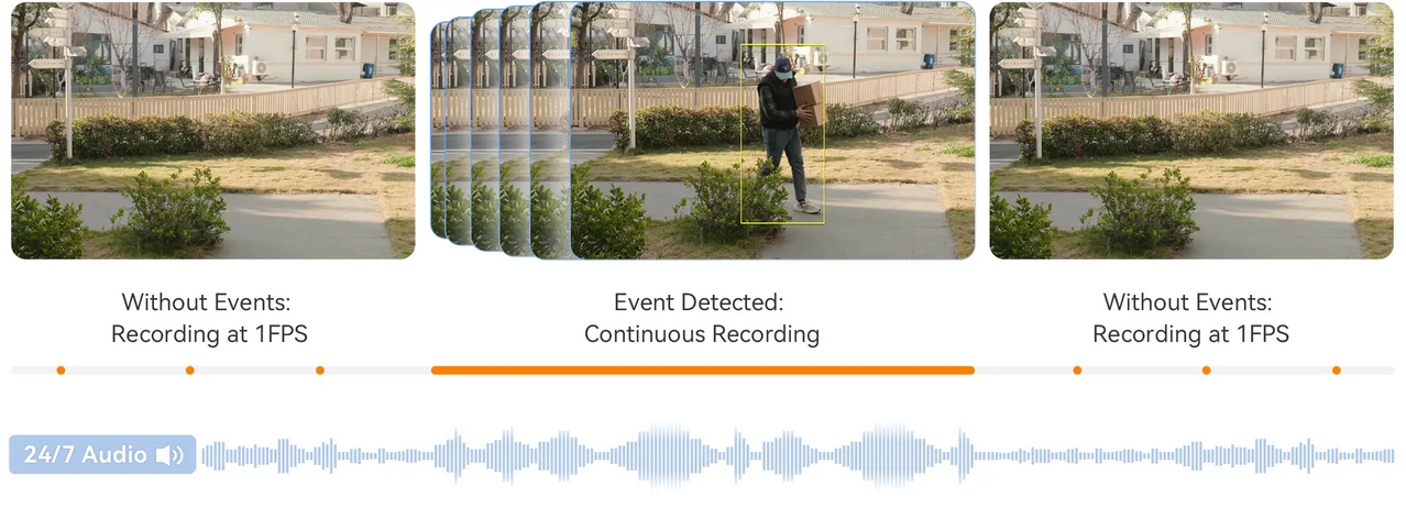Imou All-day Storage Saving Recording(AOR Mode) saves space by lowering frame rate during inactivity, yet never misses key moments.