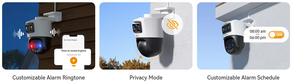 Flashing red-blue lights, bright white spotlight, and a loud siren work together to scare off unwanted visitors instantly.
