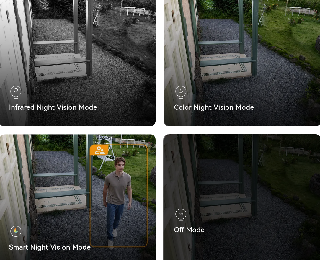 With 4 Smart Night Vision Modes that adapt to different environments, you can always get the view you need.