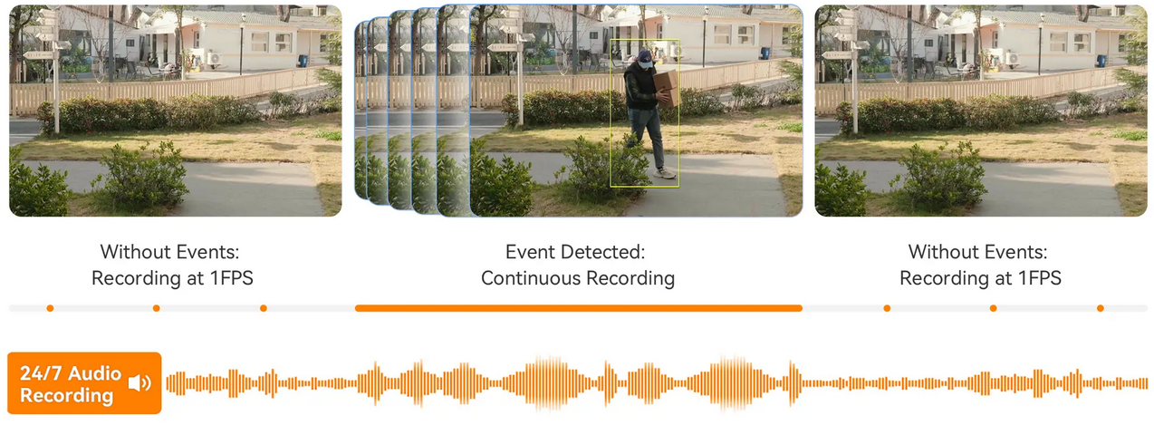 Records continuously while saving storage: full-frame video during events, and 1 FPS when nothing happens.
