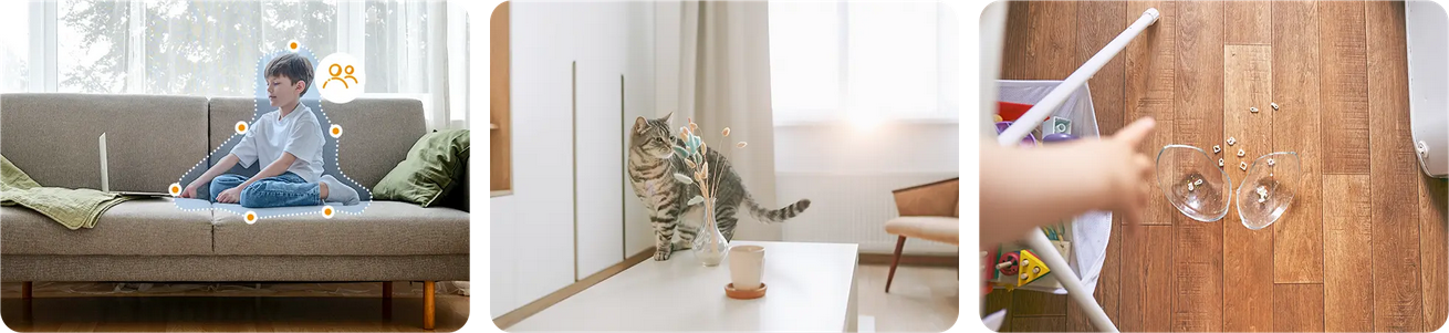 Detects people, not distractions IMOU Sense AI accurately identifies humans, keeping you informed of real security events. | Knows your pet Based on AI algorithm, the camera can find pet targets in images and help you to capture the vivid images and videos for lovely moments. | Hear the unexpected Get instant alerts for unusual sounds like breaking glass or a baby crying. |