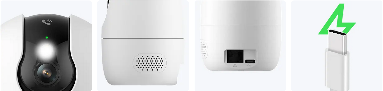 White light for enhanced visibility | Upgraded speaker, much bigger for clear communication | Ethernet port for stable connectivity | USB-C port for easy power access |