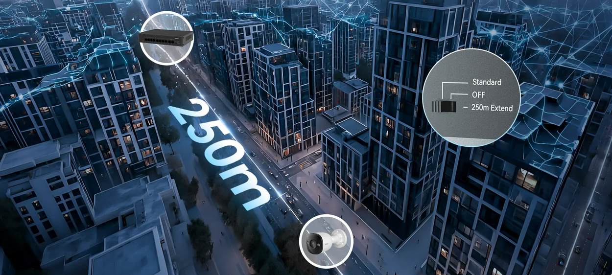 One-click mode switching unlocks extended transmission up to 250 meters—perfect for parking lots, outdoor dining areas, or warehouse corners where standard Ethernet falls short.