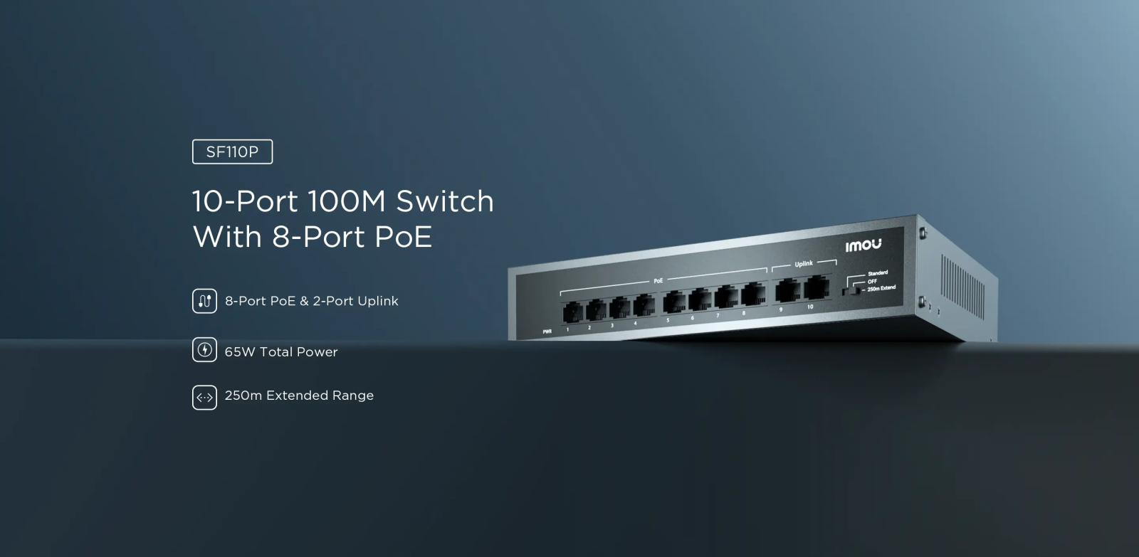 8x 10/100 M PoE ports, 2x 10/100M Uplink ports