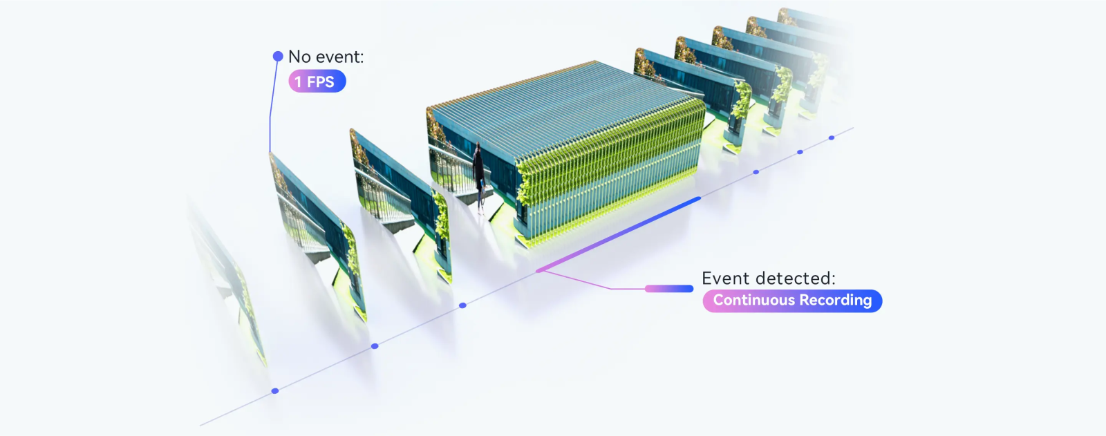 Continuously records 24/7 with full-frame video during events and low-frame capture when idle, saving up to 80% storage without missing a moment.