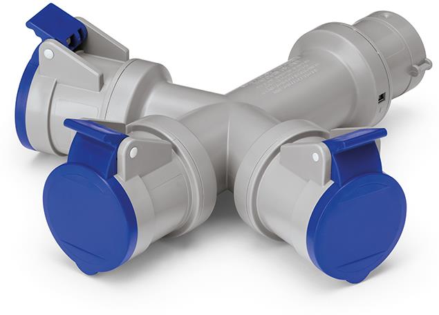 Индустриален адаптер IP44 от евро щепсел 2P+Е 16A към 3х2P+Е 16A серия Adapto Scame
