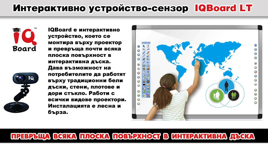 Интерактивната повърхност действа като компютърен екран, като едновременно с това запазва основната си роля на нея да се пише. С помощта на мултимедийния проектор на нея може да се правят презентации на уроците и учителят да води бележки или да маркира отделни теми и пасажи по екрана. Уроците могат да се записват и по-късно ученици и студенти да преглеждат видеоматериала при самоподготовка. Чрез IQ board LT учениците / студентите могат да участват активно в часовете и да изнасят свои презентации и материали. Приложението на IQ board LT не се ограничава само до работа в училищата – те могат да се използват навсякъде, където се провеждат срещи, презентации и обучения.