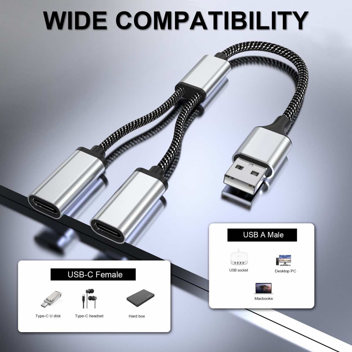 Свързаност: USB-A мъжко към 2xUSB-C женско